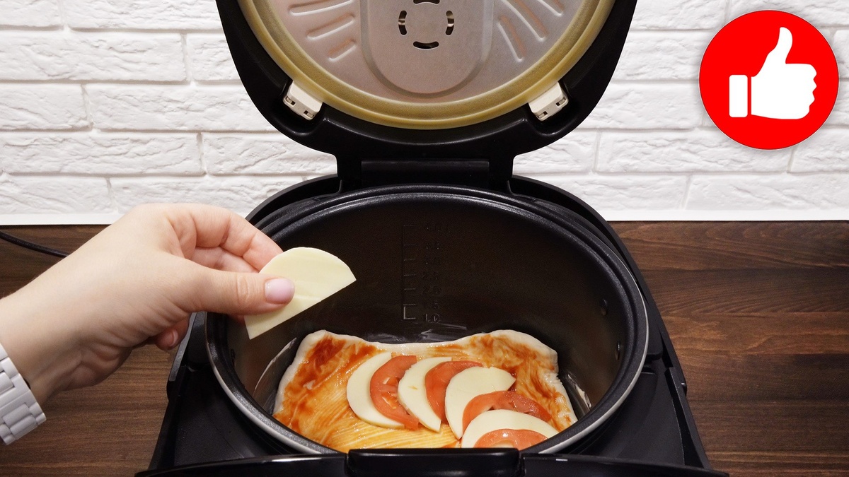 На тесто аккуратно распределить кетчуп, равномерно покрыв его. Далее, нарезайте сыр и помидоры: выкладывайте их поочередно, половинками, внахлест, создавая красивый узор. Пирог готовится на режиме "выпечка" или "мультиповар 130°C" в течение 45 минут.