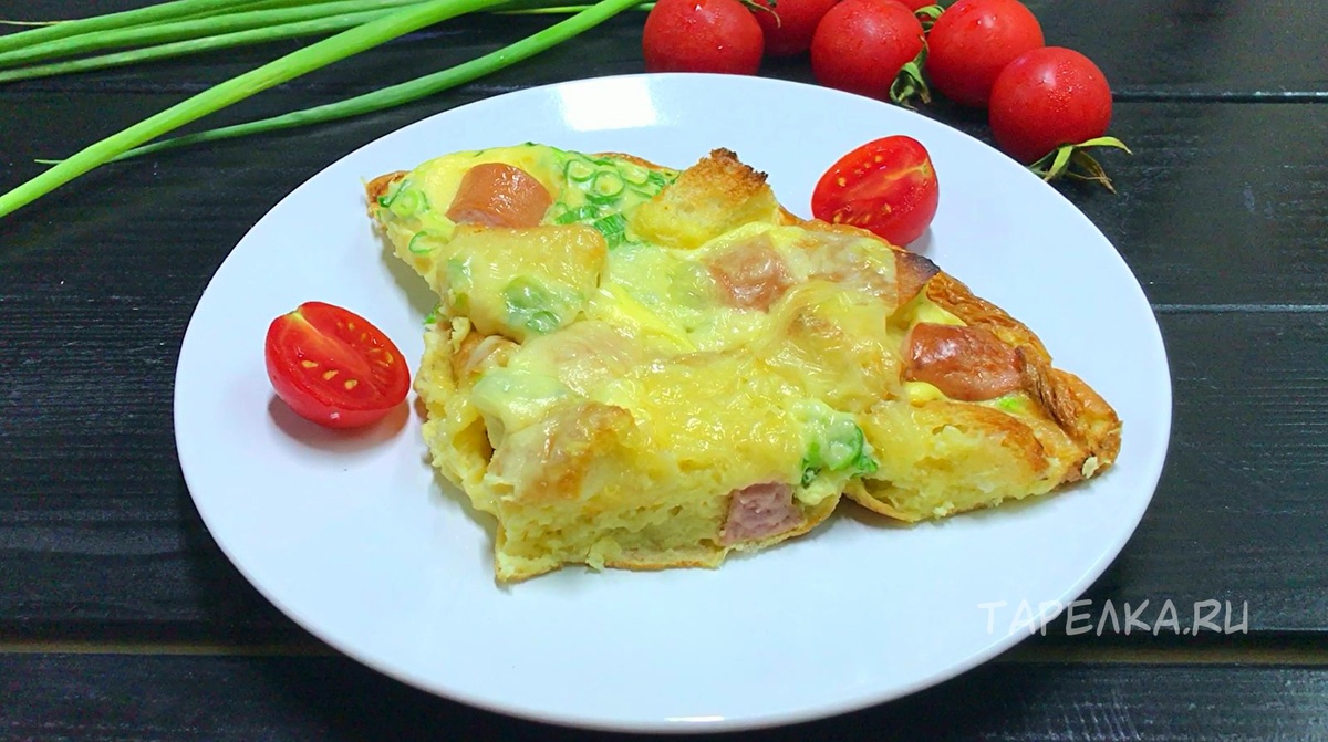 Разогрейте сковороду с небольшим количеством сливочного масла. Выложите прямо на сковороду порезанный хлеб и сосиски, затем сверху залейте яичной массой. Для завершающего штриха разместите тонкие слайсы сыра.
