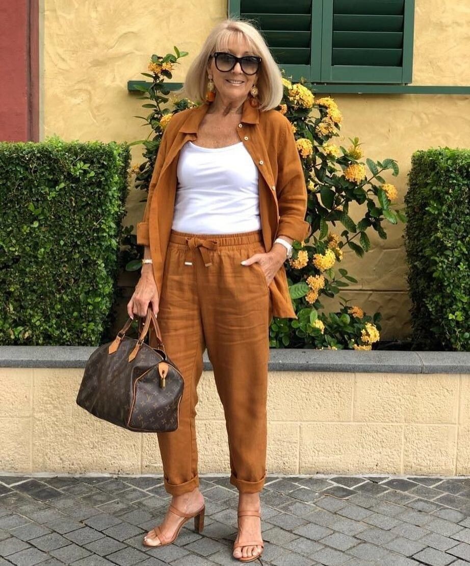 - Льняной костюм в кофейно-коричневых тонах: зауженные брюки с поясом на резинке и удлиненная рубашка создают идеальный летний наряд. Убедитесь, что топ будет белоснежным, а обувь — сандалиями на устойчивом каблуке.