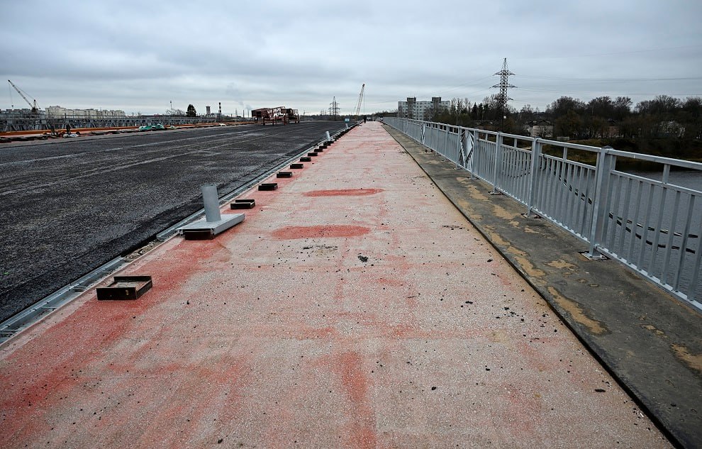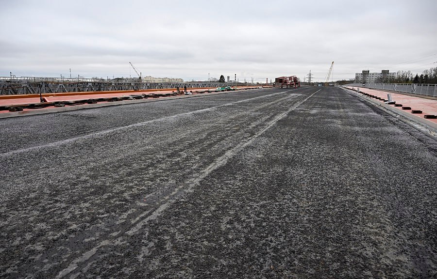 Работы на объекте идут в соответствии с графиком. В настоящее время на площадке работает 145 человек, задействовано 58 единиц техники. На мостовом переходе завершается укладка специального гидроизоляционного слоя, на финальном этапе антикоррозионная обработка пролетных строений. На подъездах к мосту сделана основа под верхний слой асфальтового полотна, который будет уложен в следующем году.