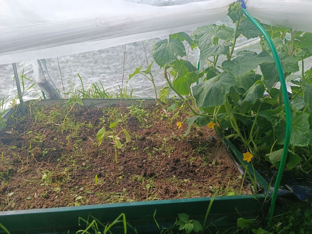 Как сообщила Диана, ситуация была обострена холодным и дождливым июнем. Все огурцы являются партенокарпиками, посаженными в конце мая. Часть грядки была укрыта пленкой «Светлица», а другая осталась открытой. Результаты оказались впечатляющими: