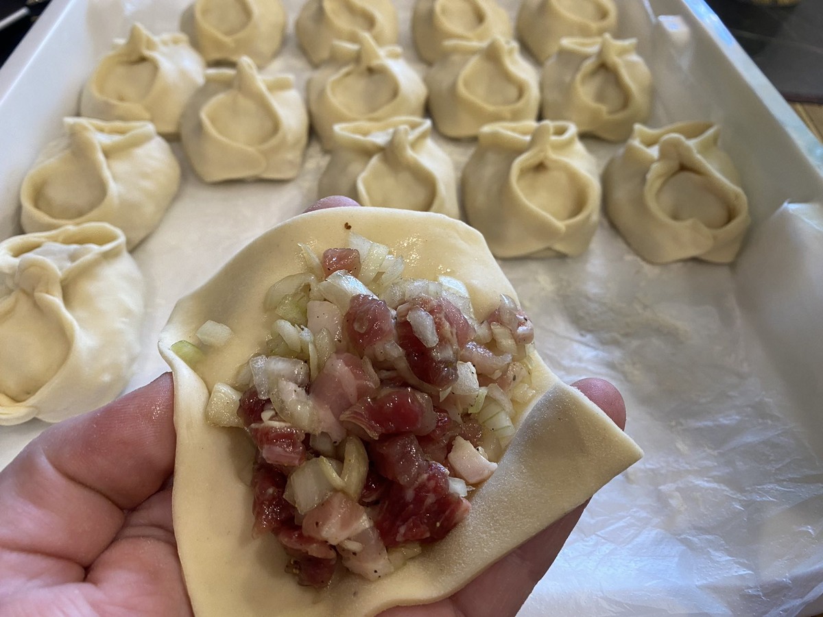 Настоящий секрет гармонии мантов – это именно начинка. Для традиционного рецепта не стоит использовать мясорубку: мясо лучше нарезать мелкими кусочками. Такой подход позволяет сохранить сочность и вкус мяса, а лук, который тоже требуется нарезать, добавляет удивительную нежность начинке. Чем больше лука, тем ароматнее манты получится!