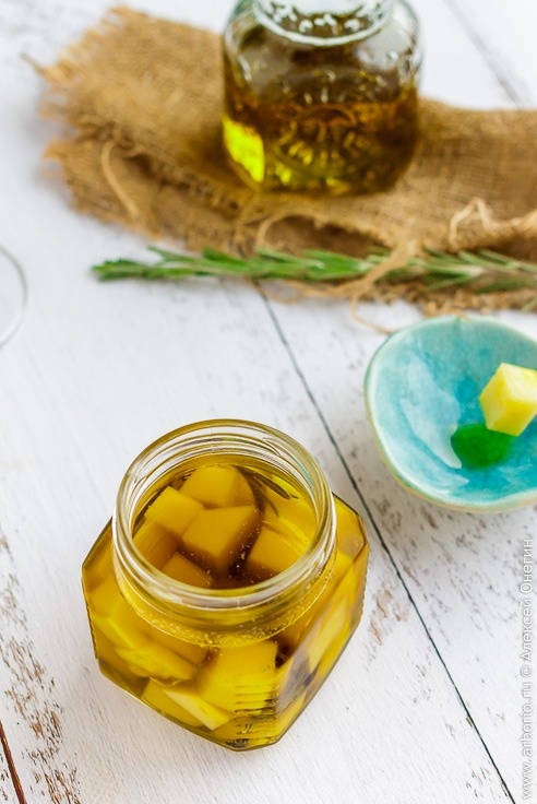 Нарезать сыр кубиками размером около 1 см, после чего залить их оливковым маслом вместе со специями. Дать настояться, и закуска готова. Идеально подходит к винам и пиву!