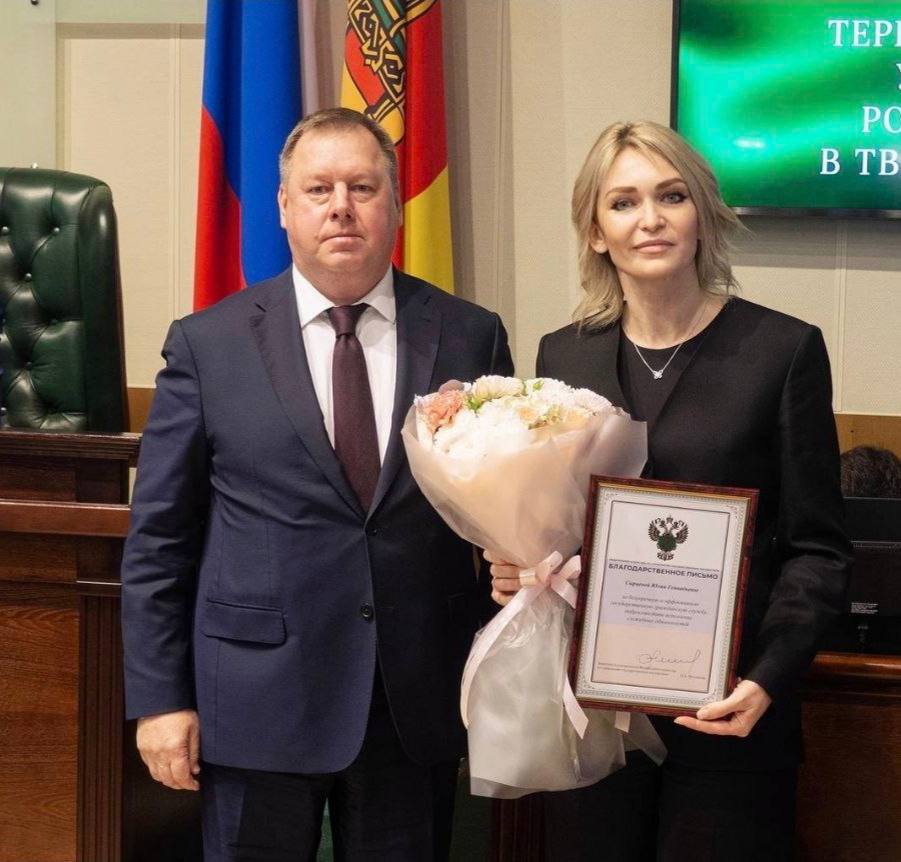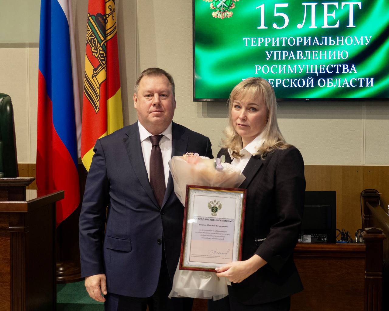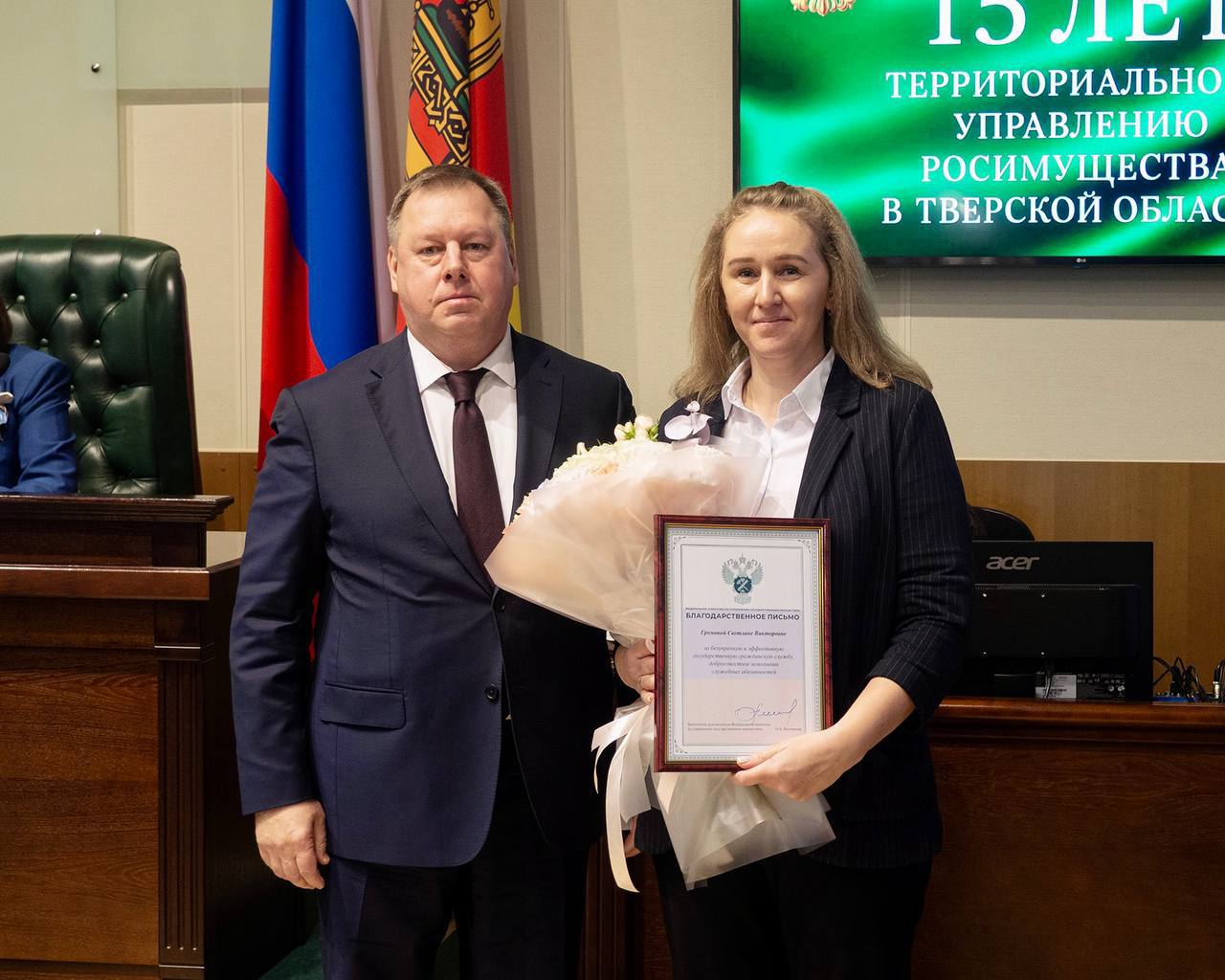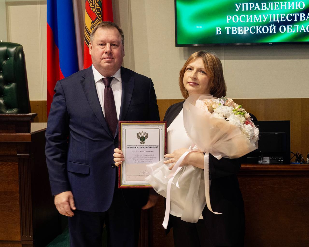 Благодарственными письмами отмечены руководитель ТУ Росимущества в Тверской области Юлия Сырцева, начальник отдела учета, управления, распоряжения федеральным имуществом и земельных отношений Юлия Лунегова, ее заместитель Надежда Бовина и главный специалист-эксперт Светлана Громова.
