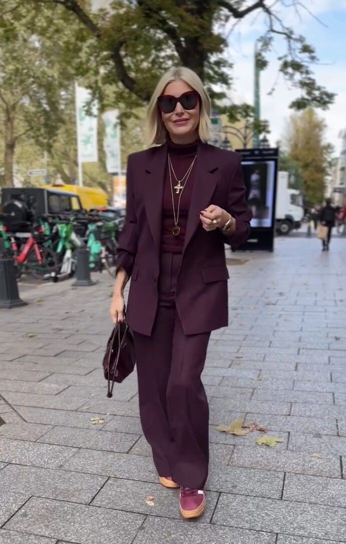 1. Элегантный костюм в бордовых оттенках станет идеальным дополнением осеннего гардероба. Он включает свободные брюки с высокой посадкой, тонкую водолазку и приталенный удлиненный жакет. Практичные светло-бордовые кеды на толстой подошве добавят запоминающийся акцент.