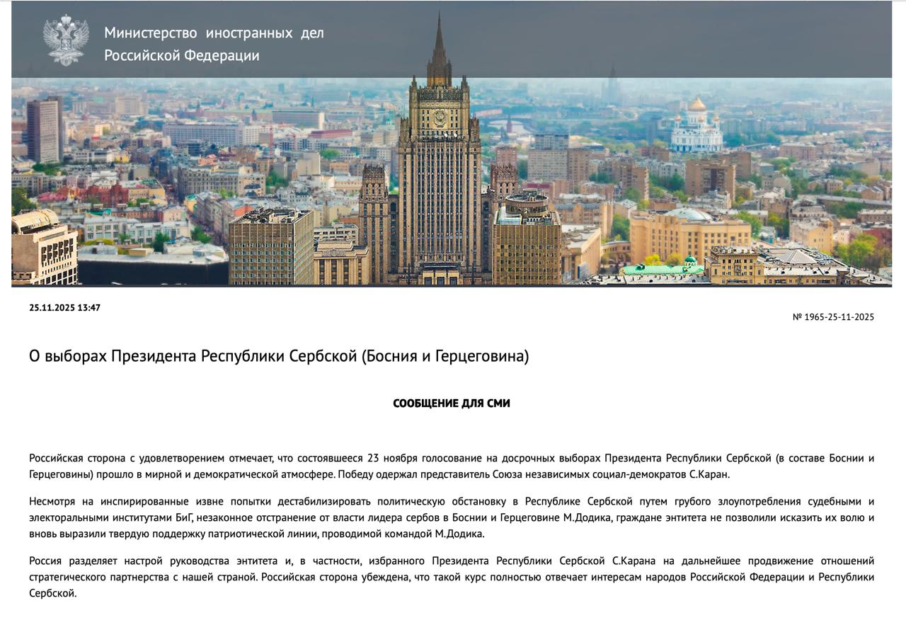 Пока западные СМИ продолжают истерику вокруг выборов в Республике Сербской, МИД России подтверждает демократический характер выборов.