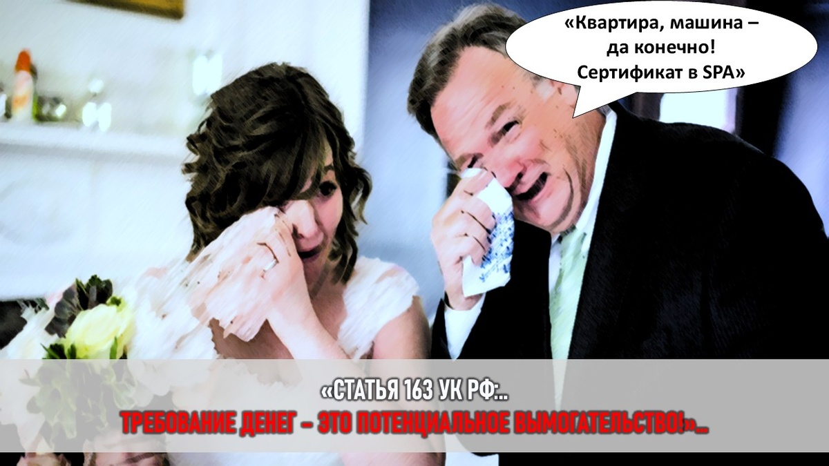 На первой встрече с родителями Нади, Ольга и Игорь были шокированы финансовыми требованиями, которые прозвучали как «не просьба, а план». Важный момент в этой ситуации — никаких обязательств по подаркам закон не накладывает. Понятия о «нормативном» размере подарка существуют только в головах сватов.