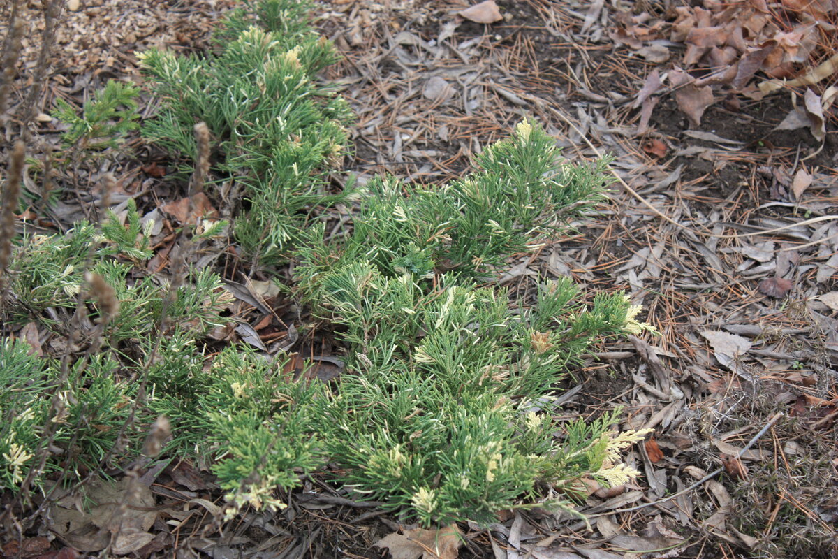 - Можжевельник горизонтальный 'Andorra Variegata': Этот сорт остаётся одним из наиболее выразительных, хотя видимые повреждения от зимних холодов также присутствуют.