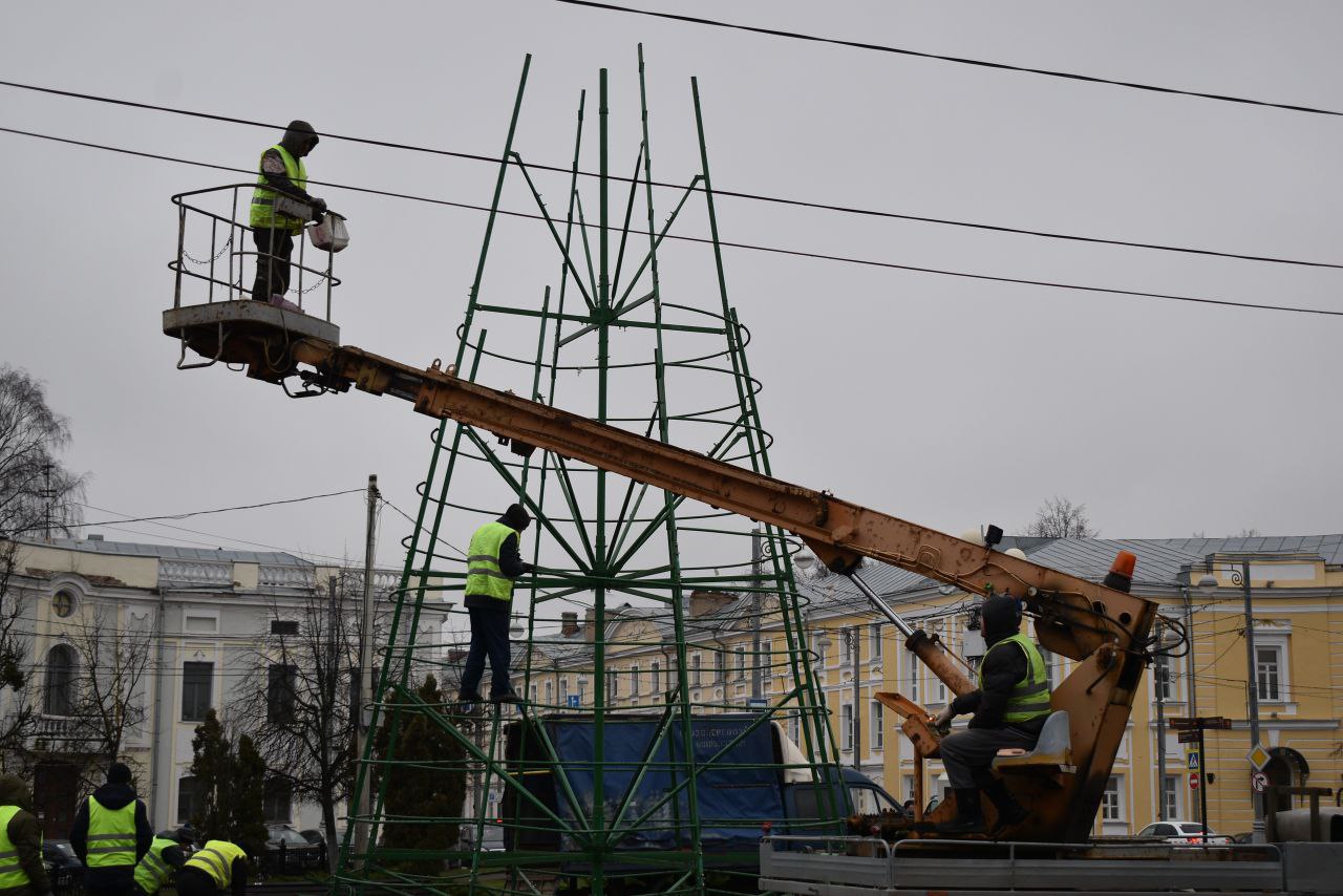 Новогодние ёлки, которые в ближайшие дни украсят шарами и светодиодными гирляндами, начали устанавливать на площади Ленина и в Городском саду.