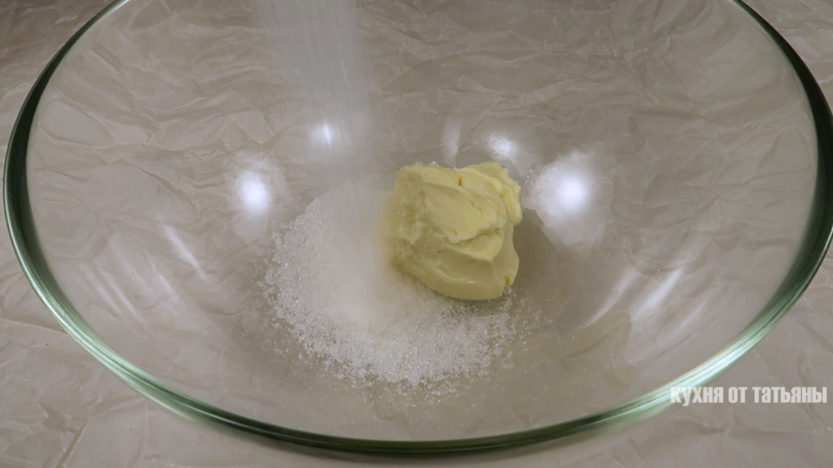 1. В глубокой миске смешать мягкое сливочное масло, сахар, немного соли и ванильный сахар до получения однородной массы.