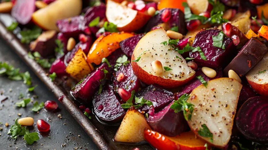 На теплую запеченную свеклу выложите брюссельскую капусту, красный перец и груши. Не забудьте добавить кусочки козьего сыра, которые слегка подтают от тепла овощей, придавая всему блюду кремовую текстуру. Завершите кулинарный шедевр гранатовой заправкой и добавьте немного кедровых орешков для остроты. Можно также украсить салат зернами граната, которые добавят яркий акцент и станут настоящим украшением стола.