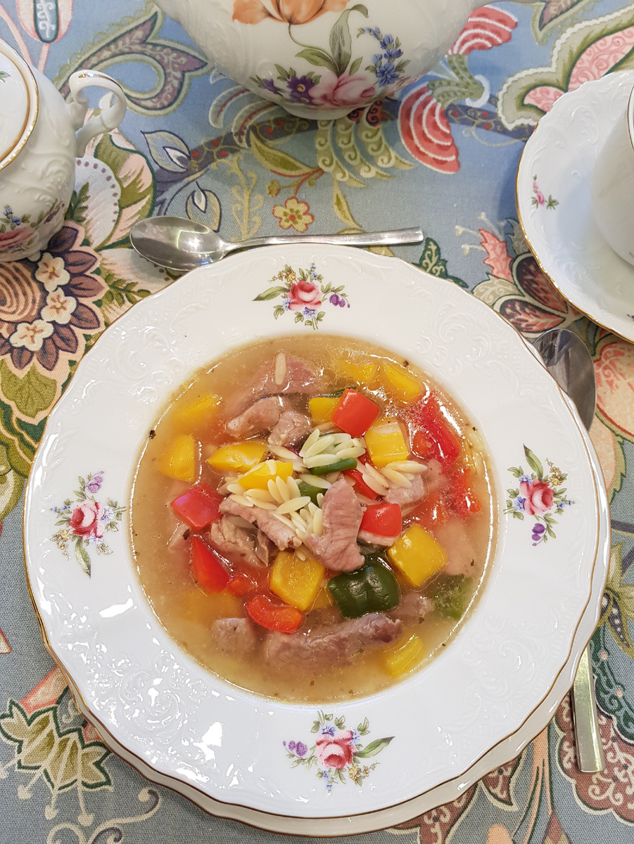 Параллельно с этим перцы очищаются от семян и плодоножек, после чего нарезаются кубиками. Когда свинина станет мягкой и вкусной, ее переводят в кастрюлю, заливают 2 литрами кипятка и доводят до кипения. Затем в яблонево-зеленую смесь добавляются нарезанные овощи, которые варятся всего 7 минут.