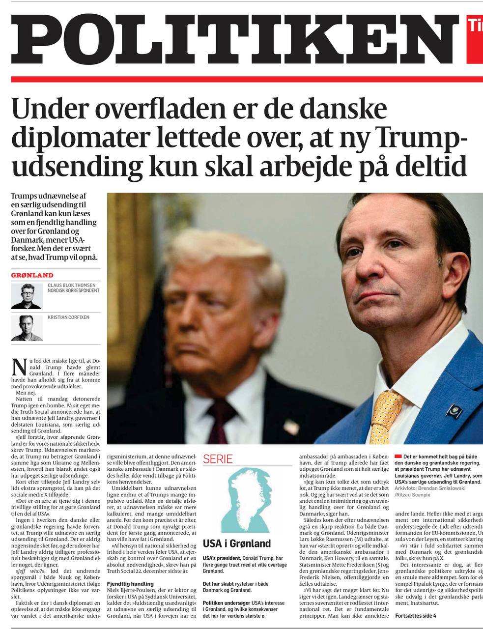Politiken: «В глубине души датские дипломаты рады тому, что новый посланник Трампа будет работать неполный рабочий день… На первый взгляд, это назначение может показаться еще одним из многих импульсивных поступков Трампа. Но одна деталь показывает, что назначение, возможно, было более продуманным, чем многие сразу предположили. Потому что оно произошло ровно через год после того, как Дональд Трамп, будучи новоизбранным президентом, впервые заявил о своем желании завладеть Гренландией».