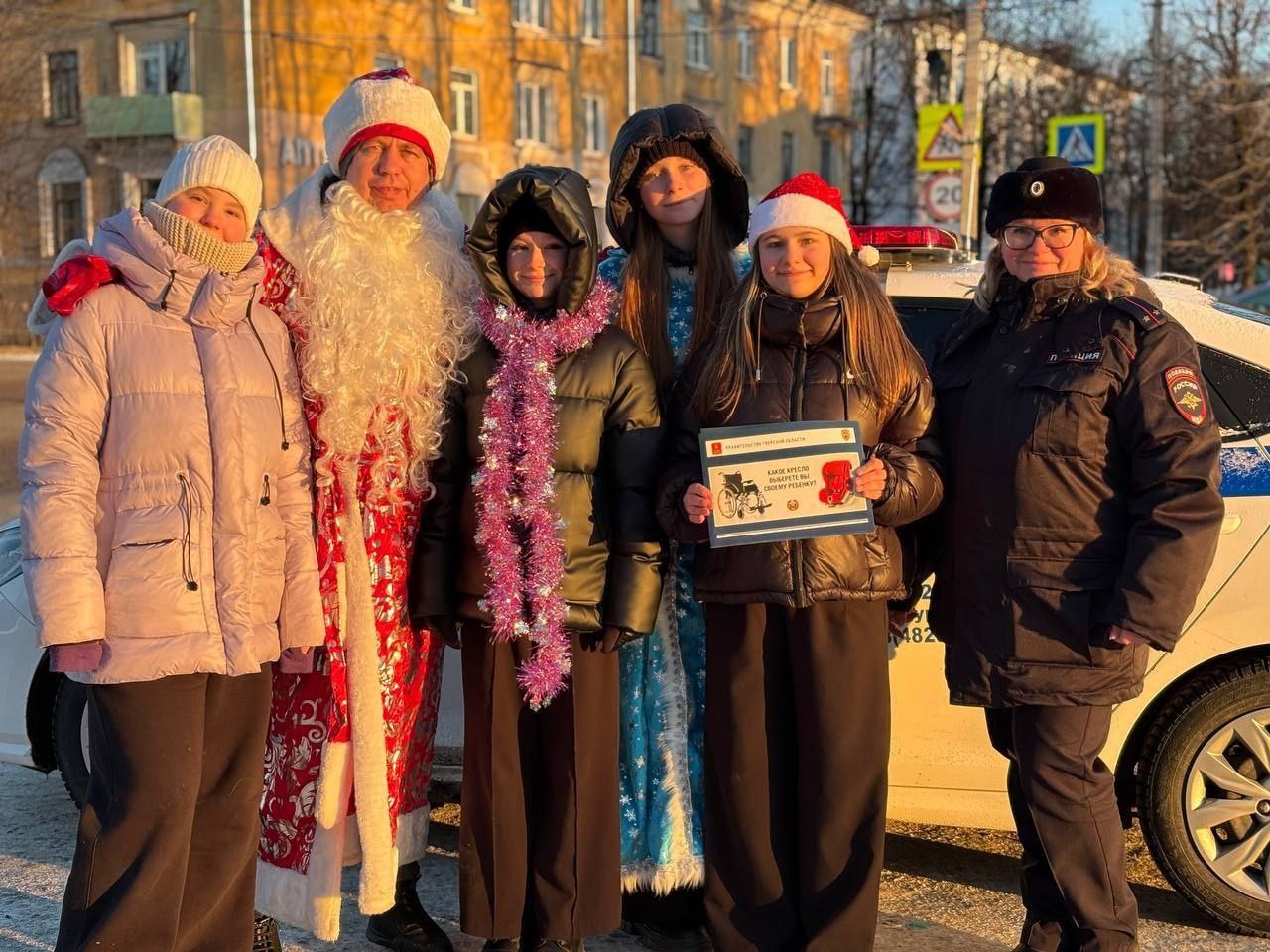В Бологом Полицейский Дед Мороз напомнил водителям о важности детских удерживающих устройств