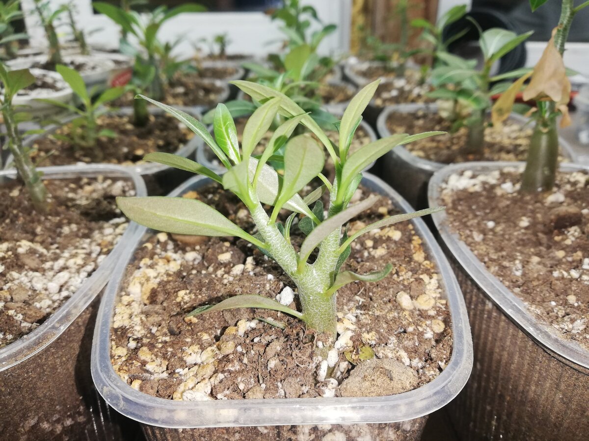 В ходе наблюдений также выяснилось, что адениумы в теплице, где естественный свет зимой все же присутствует, значительно лучше ветвятся, чем те, что выращиваются в помещении. Растения на даче, находясь под влиянием естественного солнечного света, имеют более живой вид и активно образуют боковые отростки. В то время как их домашние «соседи», несмотря на круглосуточное освещение от фито-ламп, растут более медленно, наращивая в основном каудекс. Более того, домашние адениумы наблюдаются с насыщенным зелёным цветом, в то время как тепличные обладают более бледной окраской.