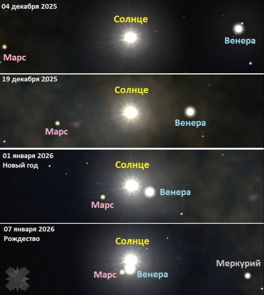 В Telegram-канале Лаборатории солнечной астрономии (XRAS) сообщили, что 7 января произойдет редкое астрономическое явление: ближайшие к Земле планеты Венера и Марс встанут на одну ось с Солнцем. К концу дня планеты и звезда выстроятся в одну линию.
