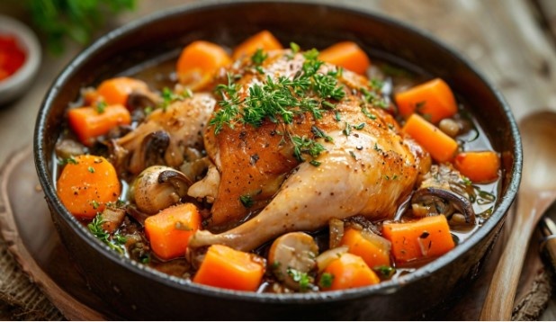 Процесс начинается с нарезки крупных овощей и грибов. В кастрюле с толстым дном разогревают смесь оливкового и сливочного масла, обжаривают бекон до золотистой корочки, затем добавляют лук и чеснок. Овощи тушат до мягкости, а потом жарят грибы до испарения жидкости. Далее курицу разрезают на куски и обжаривают до золотистой корочки. К мясу добавляют травы, все обжаренные ингредиенты и заливают вином с бульоном.