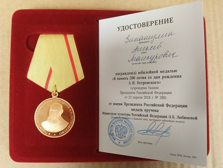 На днях сотруднику Тверской областной картинной галереи Алексею Зинатулину вручили медаль «В память 200-летия со дня рождения А. Н. Островского». Министерство культуры России отметило его значительный вклад в развитие культуры и театрального искусства Тверского региона, а также в реализацию музейных проектов, освещающих малоизвестные аспекты жизни и творчества великого драматурга.
