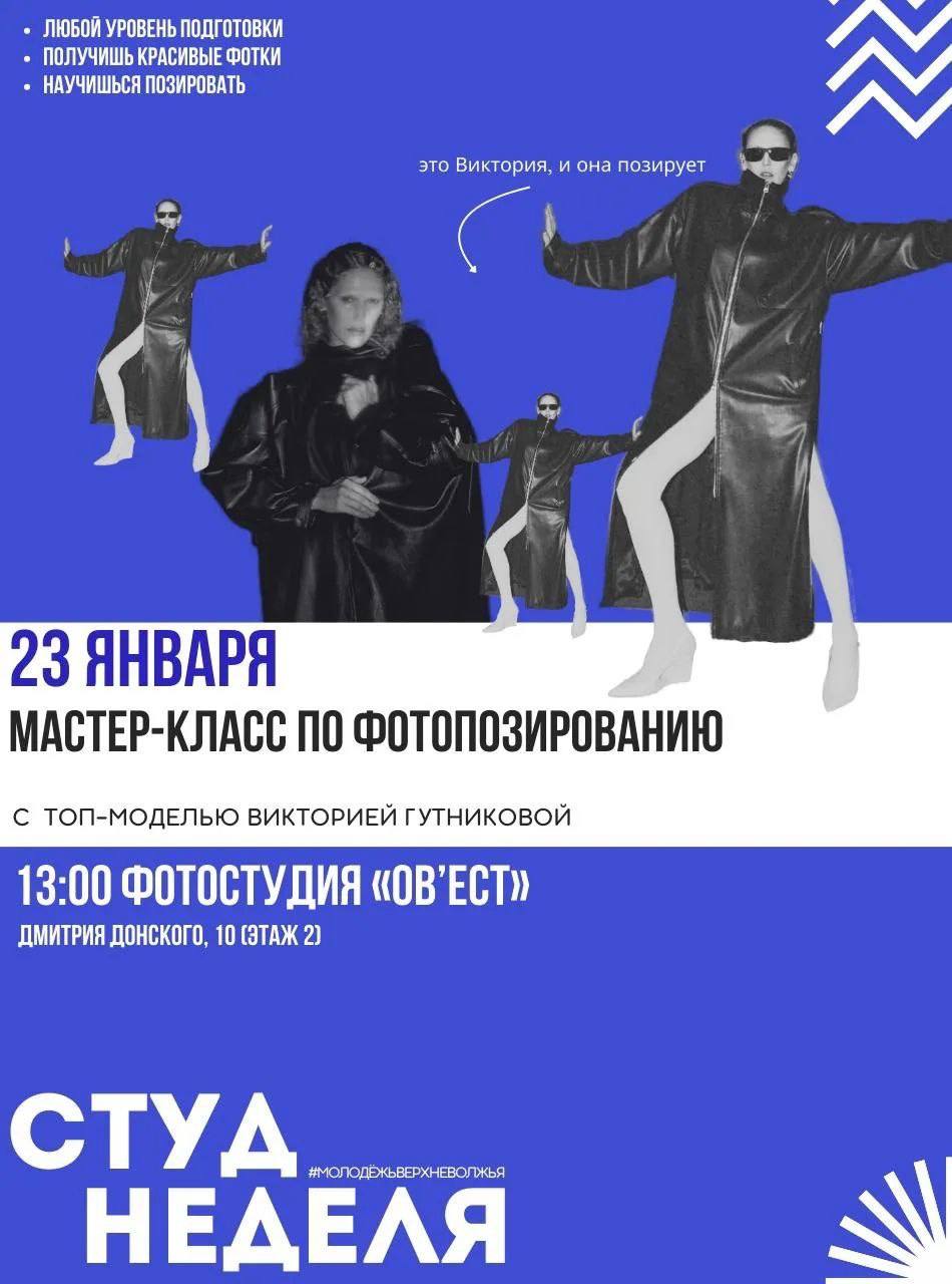 23 января молодых людей приглашают на практический мастер-класс по фотопозированию от топ-модели Виктории Гутниковой, где студенты смогут создать свои первые профессиональные портфолио. Участие во всех событиях бесплатное по предварительной регистрации.