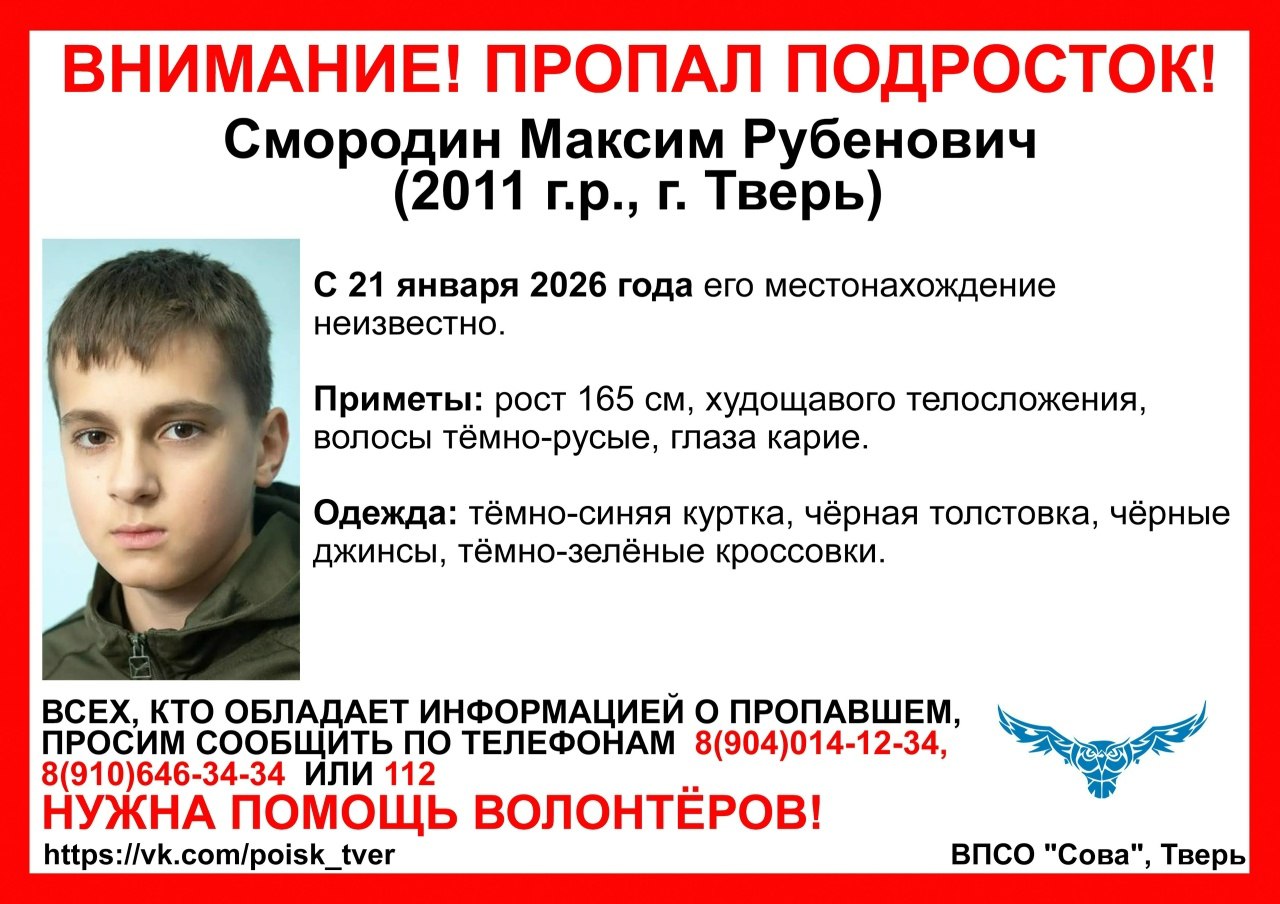 21 января в Твери пропали два 14-летних юноши. Тверской волонтерский поисково-спасательный отряд «Сова» опубликовал ориентировки для поиска детей.