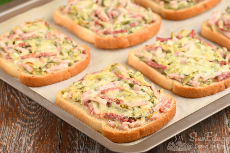 Нарезанное соломкой колбаса и маринованные огурцы в сочетании с натертым сыром создают восхитительную начинку. Все ингредиенты смешиваются и выкладываются на хлеб, а затем запекаются в духовке до румяной корочки.