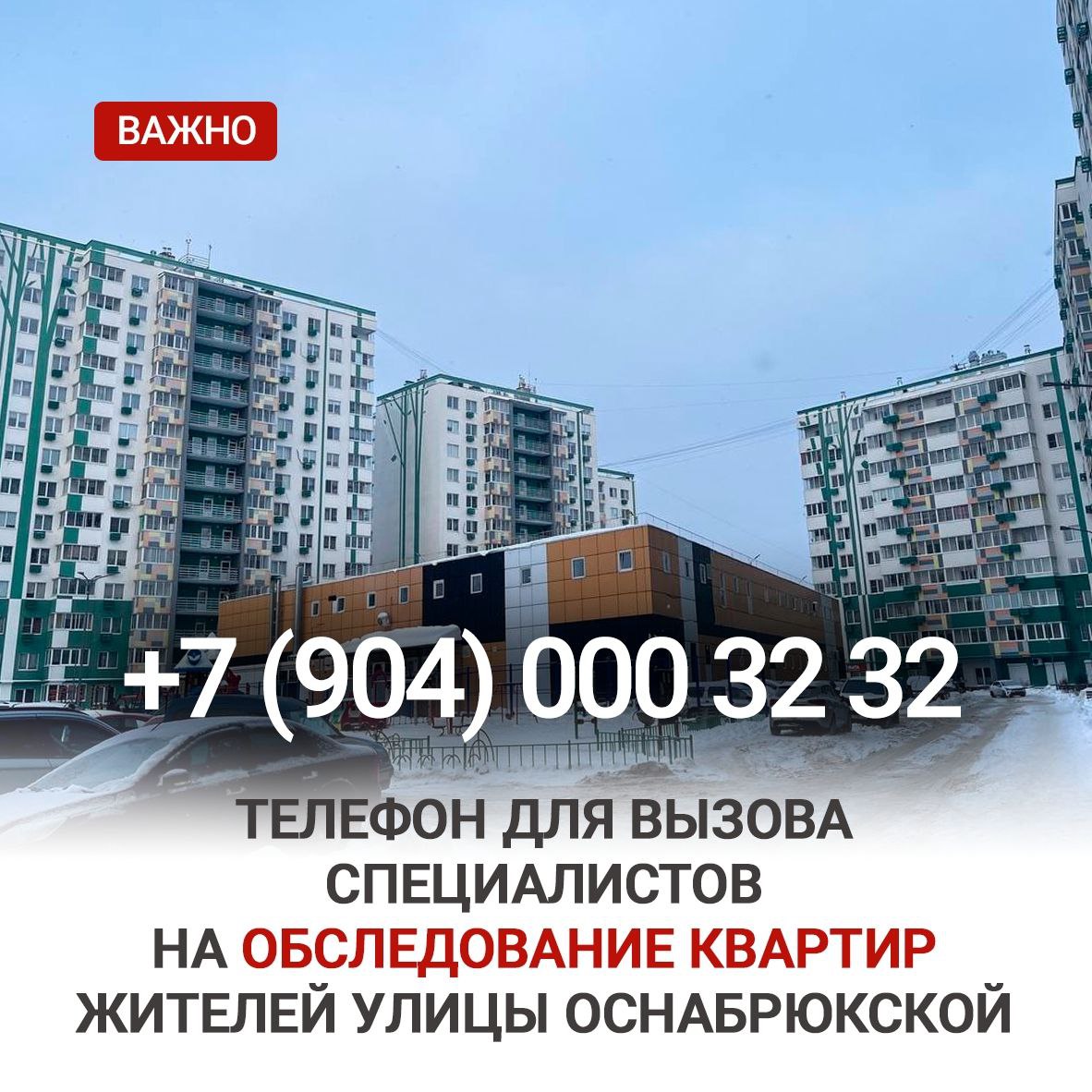 Напомним, представители управляющей компании «Эталон» продолжают работу с жителями домов №№ 12, 12 к.2, 14, 16 на улице Оснабрюкской и дома № 2 на улице С. Лоскутова, оказавшихся в зоне отражения атаки БПЛА в ночь на 12 декабря.