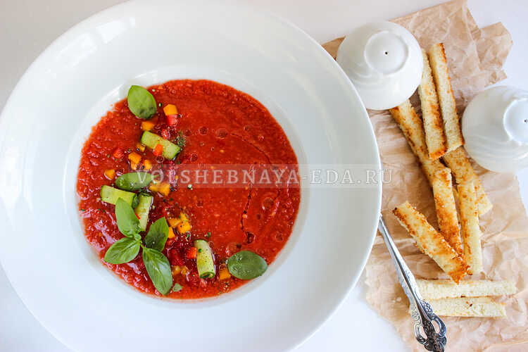 Гаспачо — это не просто суп, это кулинарная классика Испании, с ярким вкусом лета. Основные ингредиенты включают спелые помидоры, а также огурцы, красный перец, лук и чеснок. Для добавления кислинки в блюдо используют лимонный сок, херес или уксус. Обычно в гаспачо добавляют черствый хлеб, который заливают, чтобы сделать суп более насыщенным. Однако в ресторанной версии хлеб, как правило, подают отдельно, в виде сухариков или крутоны.
