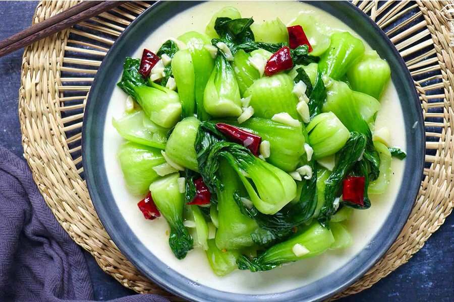 Разрезать бок-чой вдоль на половинки или четвертинки, в зависимости от размера. Мелко нарезать сушеный чили и чеснок.Смешать кукурузный крахмал с солью и сахаром, добавить столовую ложку воды для получения однородной массы.В большой кастрюле довести до кипения много воды, добавить половину чайной ложки соли и опустить бок-чой. Бланшировать 20-30 секунд, затем откинуть на дуршлаг.Разогреть глубокую сковороду на сильном огне, добавить растительное масло. Положить чеснок и чили, обжарить до появления аромата (около 20 секунд).Переложить в сковороду бланшированный бок-чой и обжаривать, постоянно помешивая, на сильном огне в течение полминуты.Добавить подготовленную суспензию, предварительно ее перемешав, и тщательно перемешать все ингредиенты. Снимать с огня, блюдо готово.Приятного аппетита!