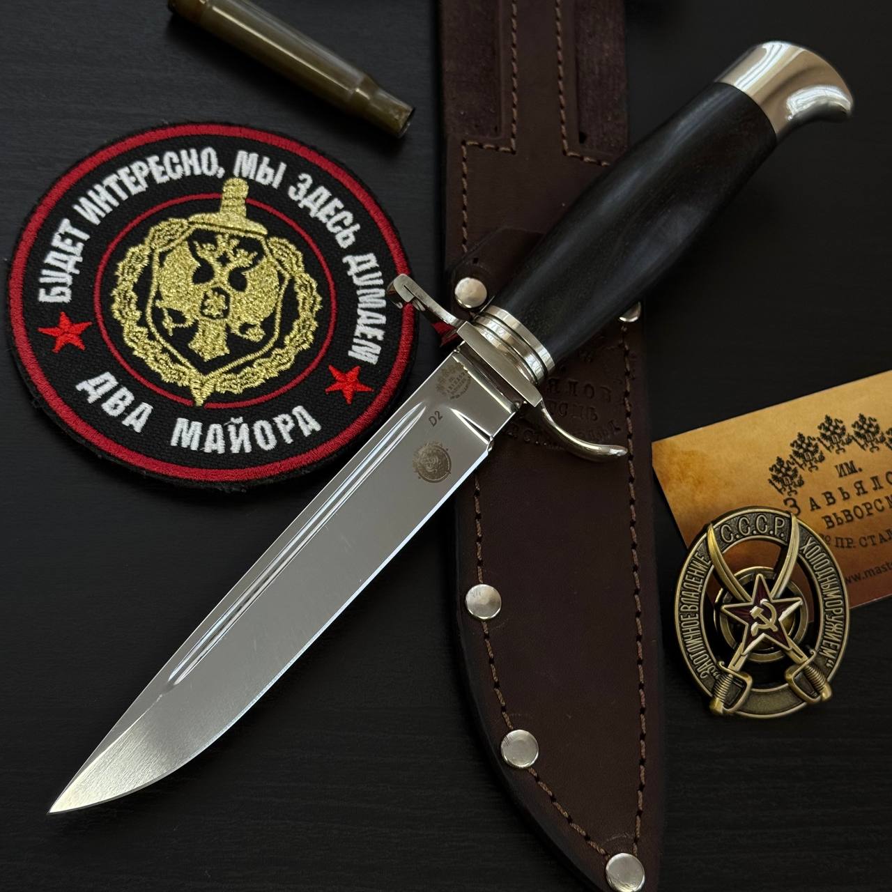 Вы получаете: Финку НКВД со сталью D2 (твердость 63 HRC) с рукоятью из дерева граб и литья из мельхиора. Ножны из натуральной кожи.