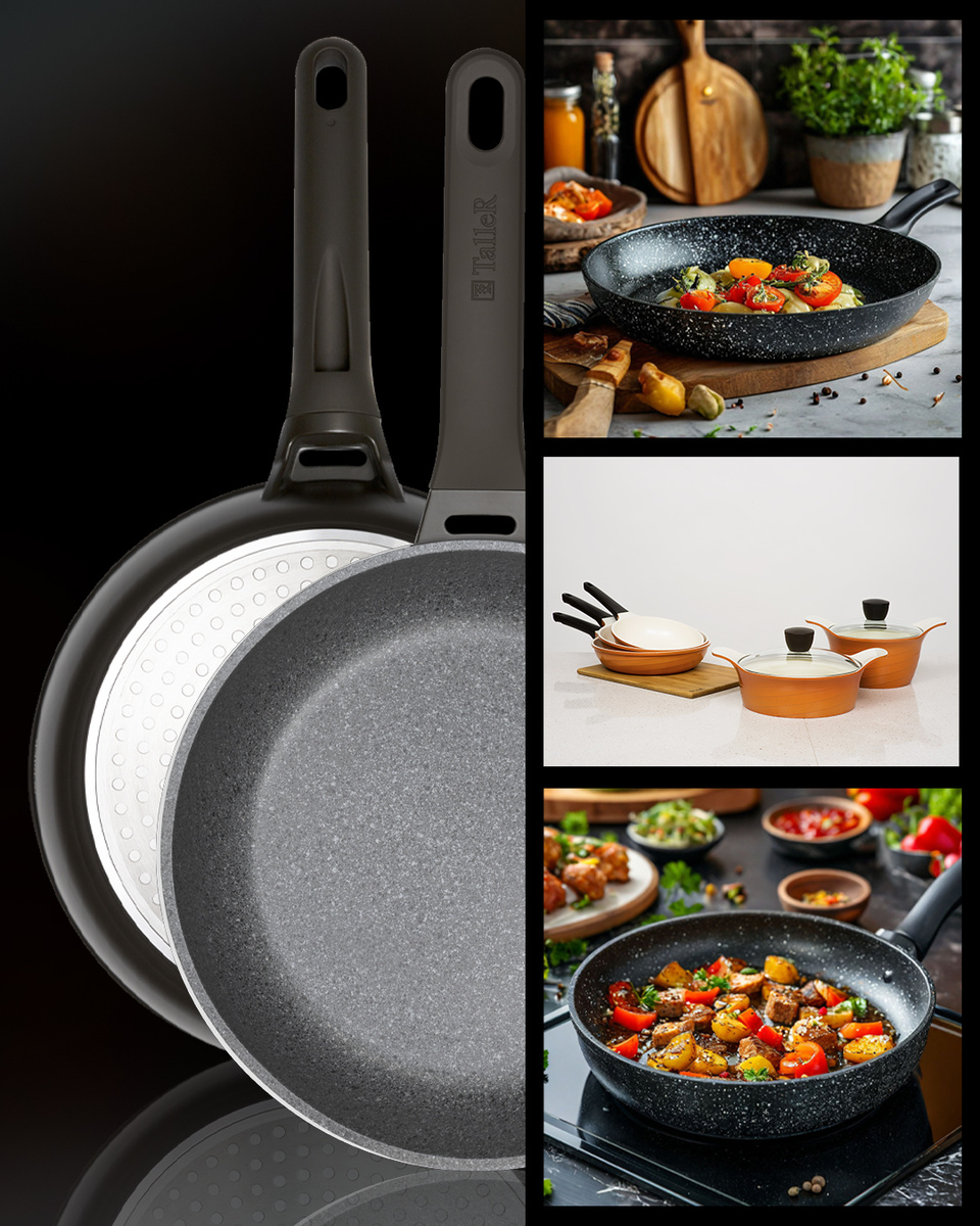 На выбор предлагаются различные виды антипригарных покрытий: мраморные, гранитные, керамические и титановые, каждый из которых имеет свои особенности и преимущества. Независимо от того, какой материал будет выбран, грамотный уход и правильное использование позволят продлить срок службы посуды.