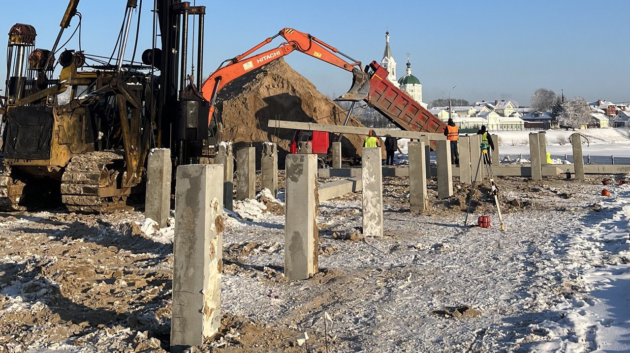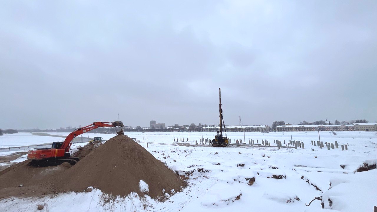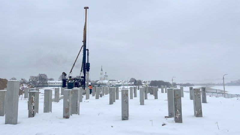 Как сообщили в компании, на площадке ведётся устройство свайного поля, погружено 113 из 464 свай. Перед этим проведено погружение пробных свай для определения несущей способности грунтов. Также прошли статические испытания свай на нагрузку.