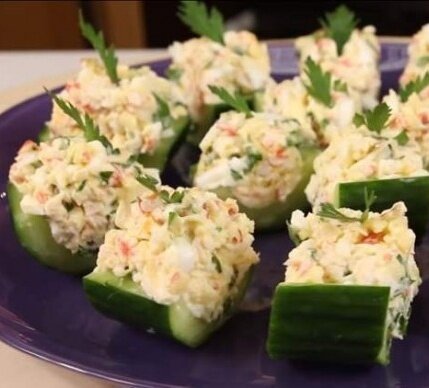 Получившиеся половинки огурцов заполняются начинкой, а затем нарезаются на небольшие порционные кусочки шириной около 2,5-3 сантиметров.