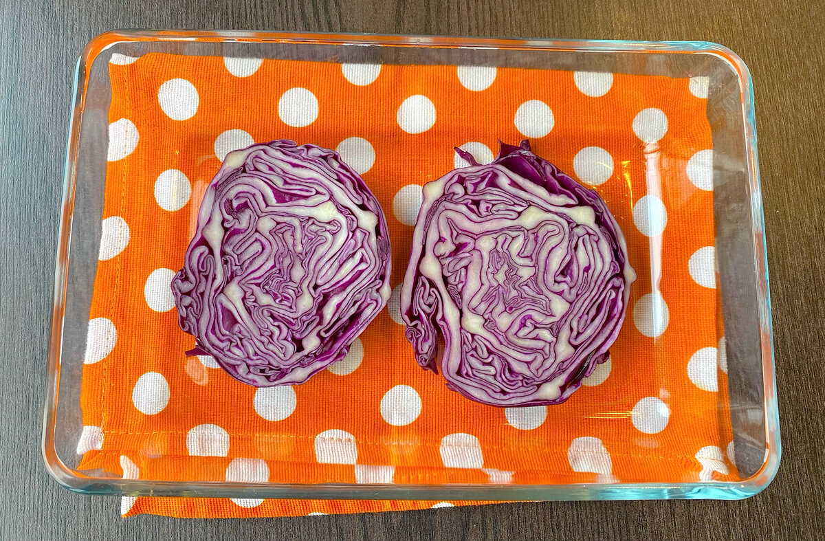 1. Из выбранной капусты отрезают два толстых стейка и аккуратно выкладывают их на дно огнеупорной формы.