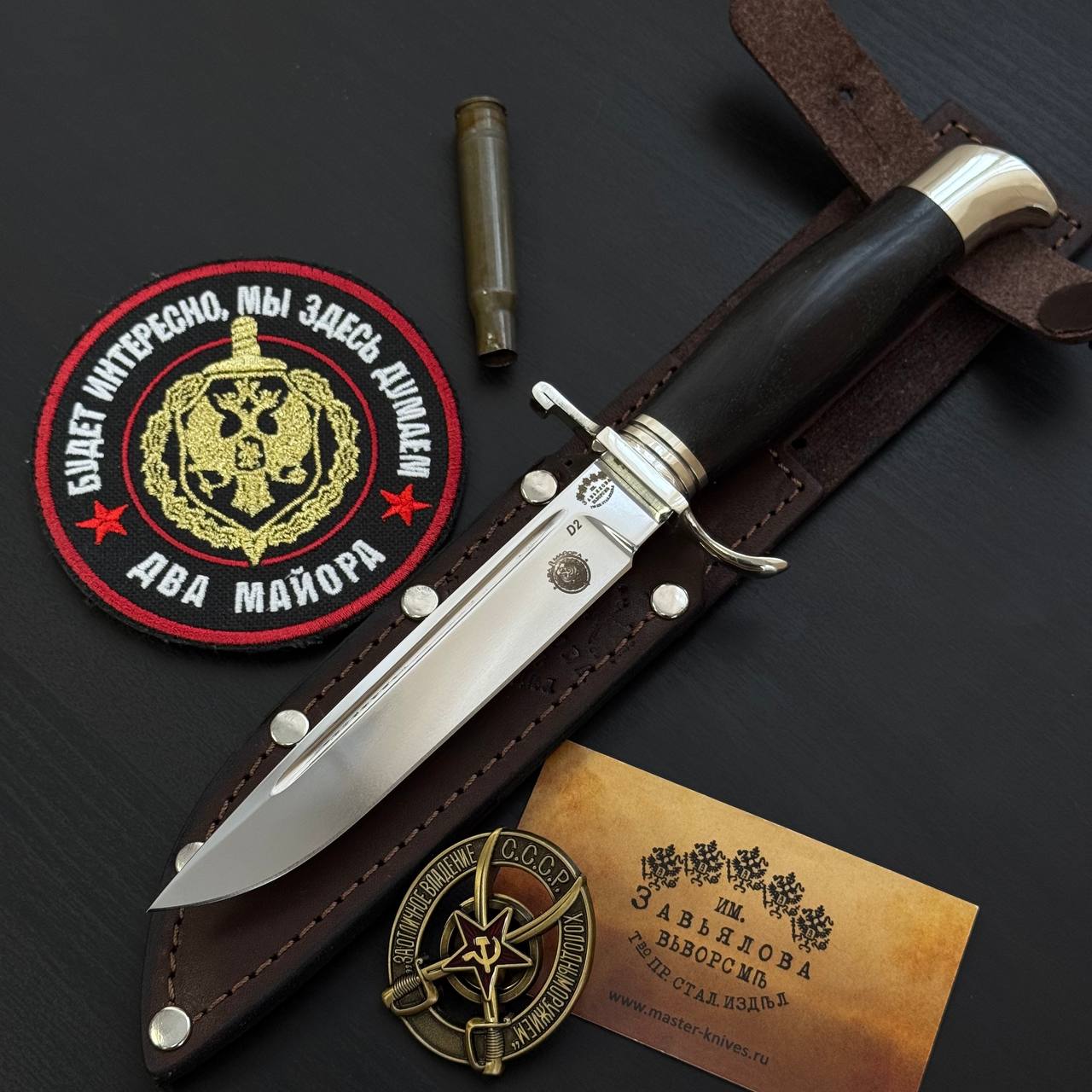 Вы получаете: Финку НКВД со сталью D2 (твердость 63 HRC) с рукоятью из дерева граб и литья из мельхиора. Ножны из натуральной кожи.