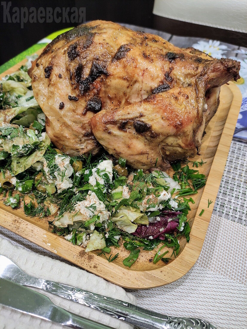 После того как курица готова, аккуратно переложите её на блюдо и окружите свежим салатным миксом. Идеальное угощение для любого случая!