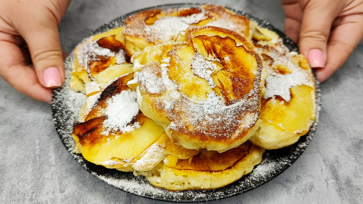 Готовить на небольшом огне под крышкой следует 3-4 минуты с каждой стороны. Как только оладьи зарумянятся, их можно аккуратно переложить на тарелку, оставить остывать и присыпать сахарной пудрой.