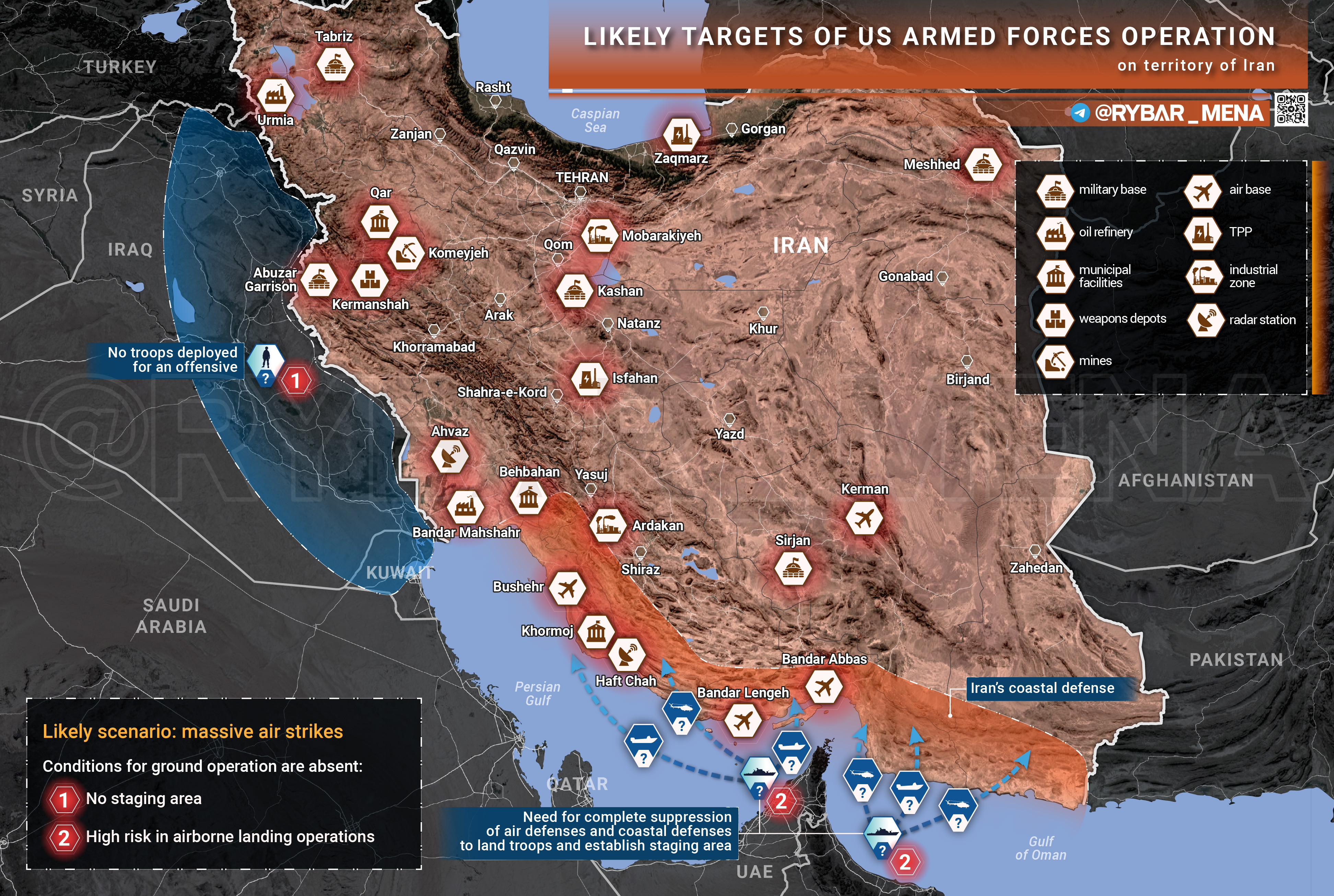 Особое внимание будет уделено позициям КСИР вблизи Тегерана и в провинции Исфахан. Там сосредоточены командные пункты и исследовательские центры, а также ракетные базы.