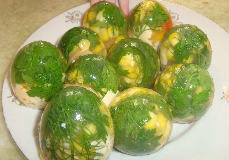 У остальных яиц сделайте небольшие отверстия в «носиках», чтобы аккуратно выбросить содержимое. Увеличьте эти отверстия для удобства наполнения и приготовьте смесь из отварных овощей, яиц, огурцов и зелени. Эту начинку аккуратно разместите в яйца, заливайте горячим бульоном с желатином и закройте отверстия. Потрясите немного, чтобы все равномерно распределилось, и оставьте до застывания.