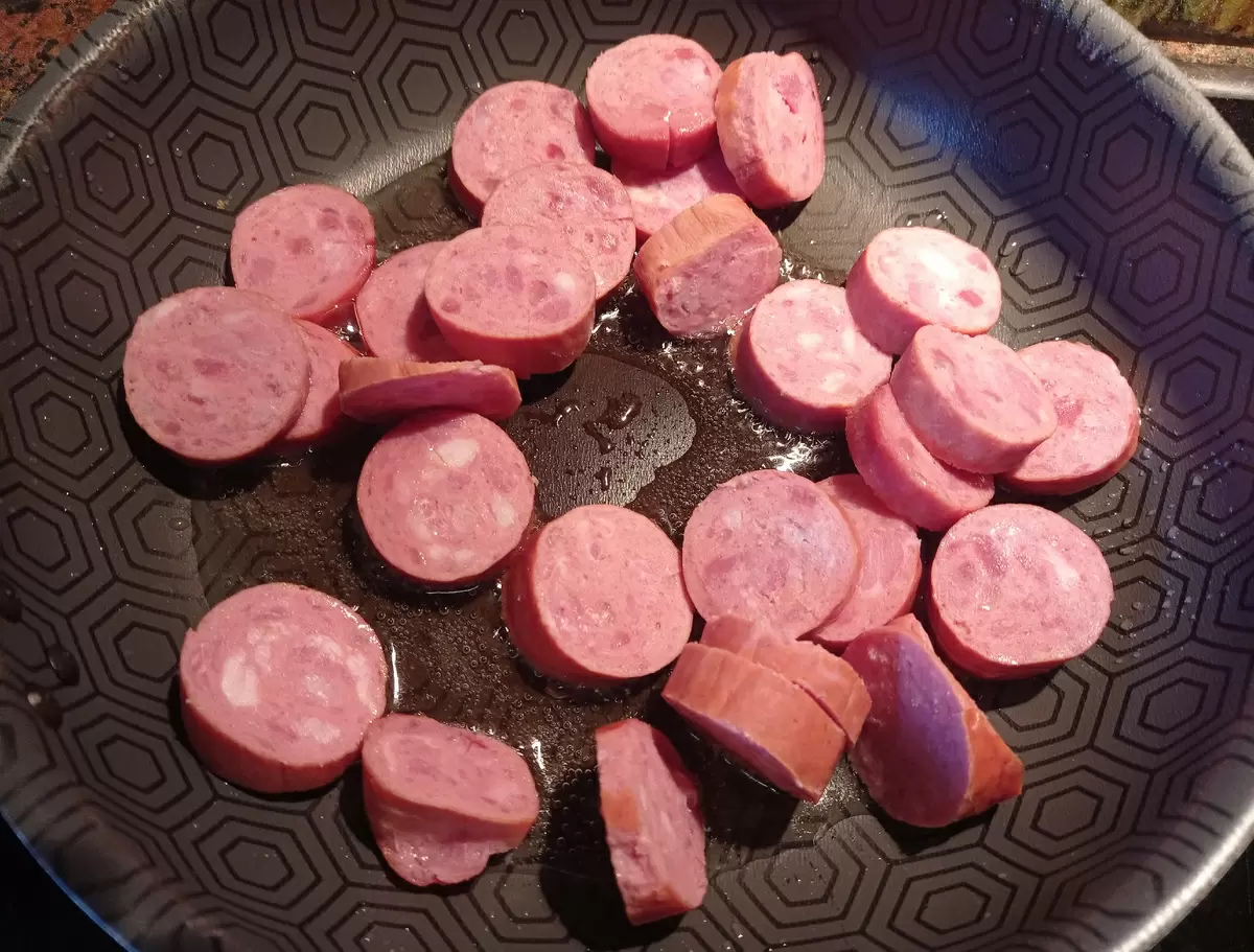 Первый шаг — нарезка колбасы. Кружочками или кубиками, как вам удобнее, она должна обжариться до золотистой корочки на сковороде с растительным маслом. После этого в ту же сковороду добавляется мелко нарезанный лук, который следует обжаривать вместе с колбасой до мягкости.