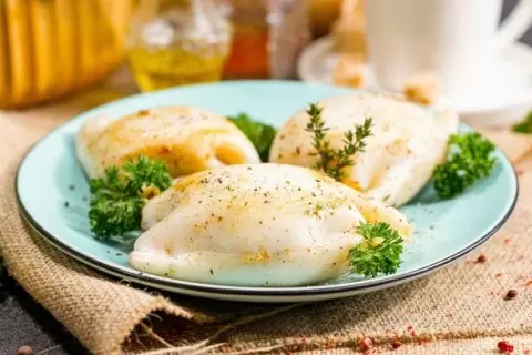 Готовые кальмары следует аккуратно выложить на тарелку, не забыв извлечь зубочистки. Украшение из свежей петрушки, тимьяна и щепотки молотого перца сделает блюдо ещё более аппетитным и привлекательным для гостей.