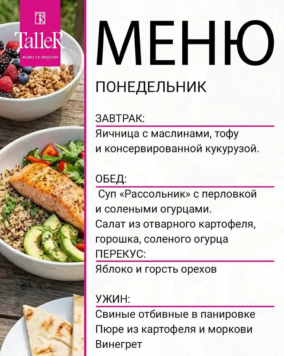 Начните неделю с насыщенного завтрака. Овсянка с ягодами и орехами обеспечит вас энергией, а лёгкий овощной салат станет отличным перекусом. На ужин приготовьте куриную грудку с картофелем и зелёным горошком — простое и сытное блюдо.