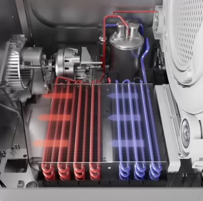 Конденсационные сушильные машины работают на принципе конденсации. Влажный воздух, проникая в устройство, проходит через теплообменник, где охлаждается и превращается в воду. Эта влага собирается в специальный резервуар или может быть отведена в канализацию через шланг. Процесс обеспечивает замкнутый цикл: воздух снова нагревается и возвращается в барабан.
