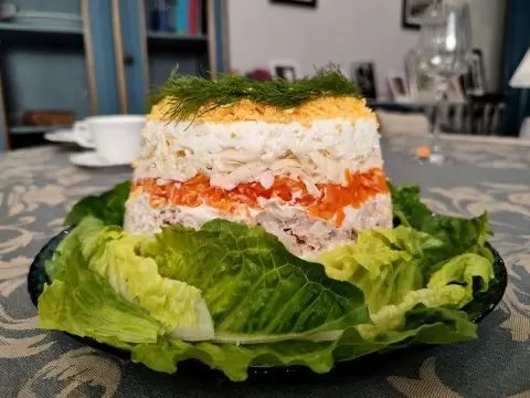 После завершения сборки, поставьте салат в холодильник на один час, чтобы он пропитался вкусами. Перед подачей аккуратно переверните его на блюдо и украсьте веточками укропа и желтками.