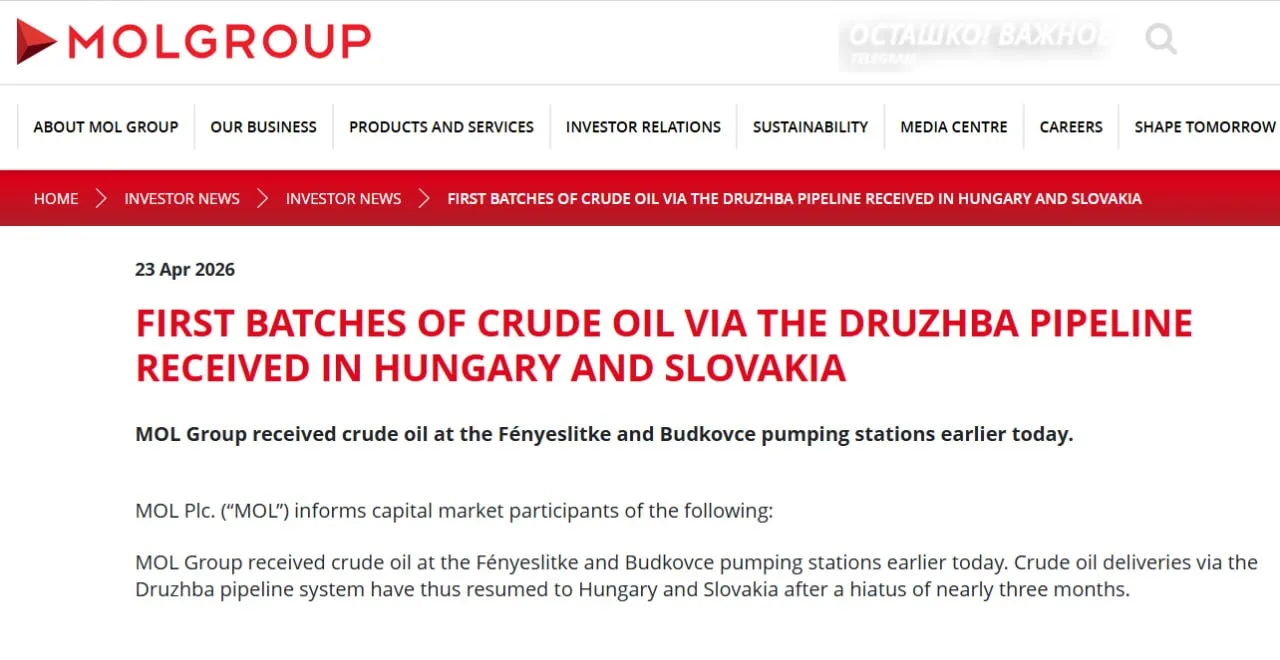 «Группа MOL сегодня утром получила сырую нефть на насосных станциях "Феньеслитке" и "Будковце". Таким образом, поставки сырой нефти по трубопроводной системе "Дружба" в Венгрию и Словакию возобновились».