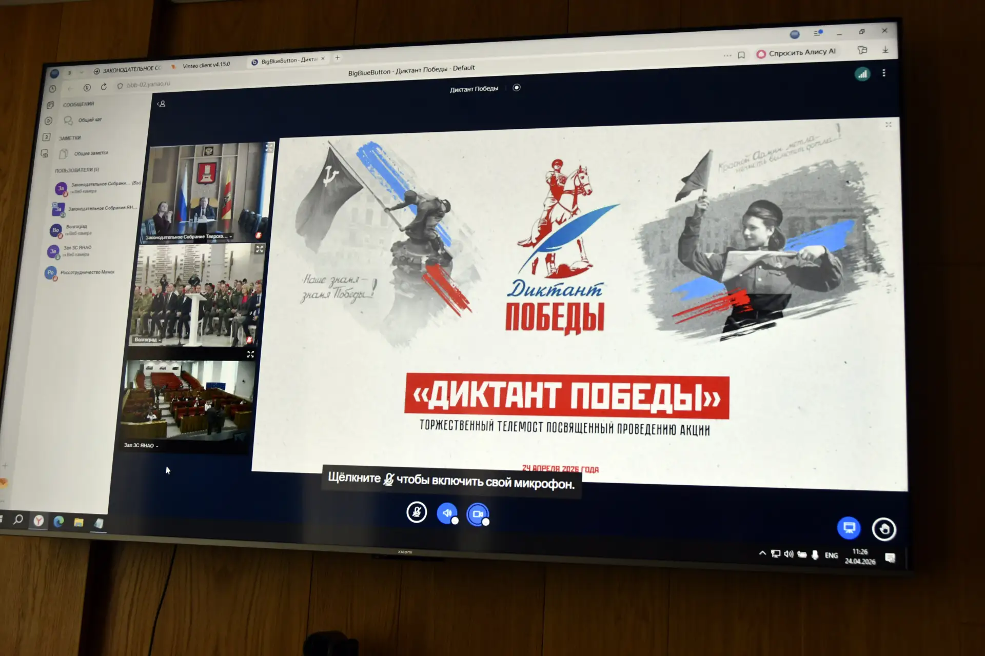 24 апреля в России, странах ближнего и дальнего зарубежья в восьмой раз прошла международная историко-просветительская акция «Диктант Победы». В честь события был организован телемост между региональными парламентами. Инициаторами мероприятия выступили депутаты Законодательного Собрания Ямало-Ненецкого автономного округа.