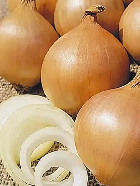 Луковицы этого сорта имеют характерную округлую форму и вес колеблется от 45 до 80 граммов. Сухие чешуйки окрашены в соломенно-желтый цвет с лёгкими розовыми или серыми оттенками — это обычная практика для данного сорта, а не признак заболевания. Плотная структура луковицы обеспечивает отличную лежкость и устойчивость к гниению.
